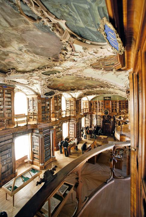 baroque triomphant. Classée au patrimoine mondial de l’UNESCO depuis 1983, elle forme un ensemble d’une rare cohérence, à la fois spirituel, culturel et artistique. Sa bibliothèque, cœur battant du monastère, est l’une des plus anciennes et des plus somptueuses du monde occidental. La salle actuelle a été édifiée entre 1758 et 1767 sous la direction de Peter Thumb, architecte originaire du Bregenzerwald, en Autriche. Elle se distingue par un décor d’une richesse éblouissante, caractéristique de l’art baroque, qui se plaît aux contrastes, à l’opulence des matières, aux jeux de lumière et à l’exubérance ornementale. Boiseries finement sculptées, fresques foisonnantes et détails rococo émerveillent les visiteurs.