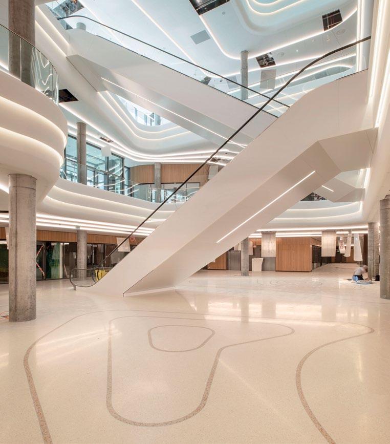 L'atrium de 18 mètres de haut met en valeur les différents éléments de liaison.