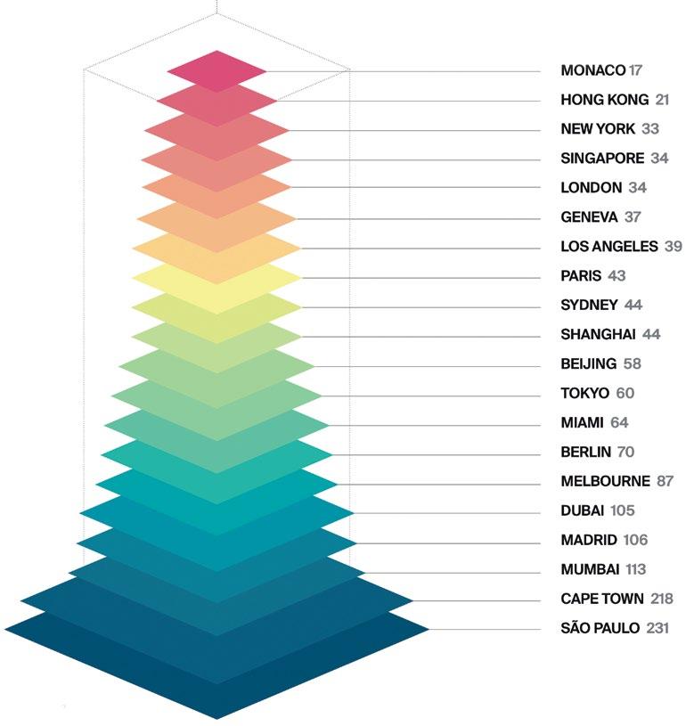 La Ville de Genève est la commune ayant enregistré le plus grand nombre de transactions de prestige (23% en termes de nombre et 11% en termes de valeur). Cologny conserve son titre de commune la plus prisée avec 498 millions de francs d’investissement (27% en termes de valeur et 14% en termes de nombre), soit un prix moyen de plus de 12 millions de francs par objet.