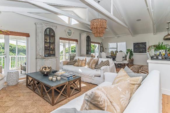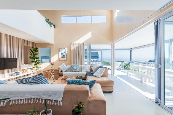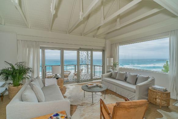 "Cliffhanger," an elegant Cape Cod?inspired hom e perched above one of the world?s m ost breathtaking beaches,offers uninterrupted 360° ocean and m ountain views Expansive Balau balconies,a private terrace,solar-heated pool,and handcrafted stone BBQ com plem ent the refined tim ber architecture and carefully curated interiors,creating a seam less blend of sophistication,com fort,and coastal living,all set within lush greenery for com plete privacy and seclusion.