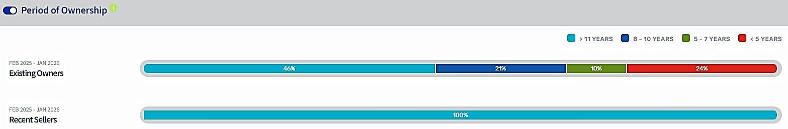 Scarborough com prises 623 freehold properties with no sectional title or estate stock, indicating a fully freehold residential m arket Ownership in the area is notably stable,with 53%of existing owners having held their properties for longer than 11years,and a further 14%owning for between eight and ten years Recent sellers sim ilarly reflect long-term tenure,with 45%having owned for m ore than 11years before selling.