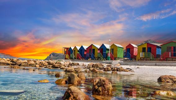 The historic,brightly coloured beach huts along the shoreline are an iconic sym bol of Muizenberg?s charm , adding character and tim eless appeal to its picturesque beachfront