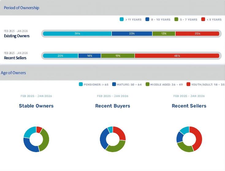 Ownership trends highlight long-term stability:39%of existing owners have held their properties for over 11years,while 25%have owned for less than five years.Conversely, recent sellers show a shorter-term holding pattern,with 48%selling within five years, reflecting active m arket participation alongside long-standing residents.