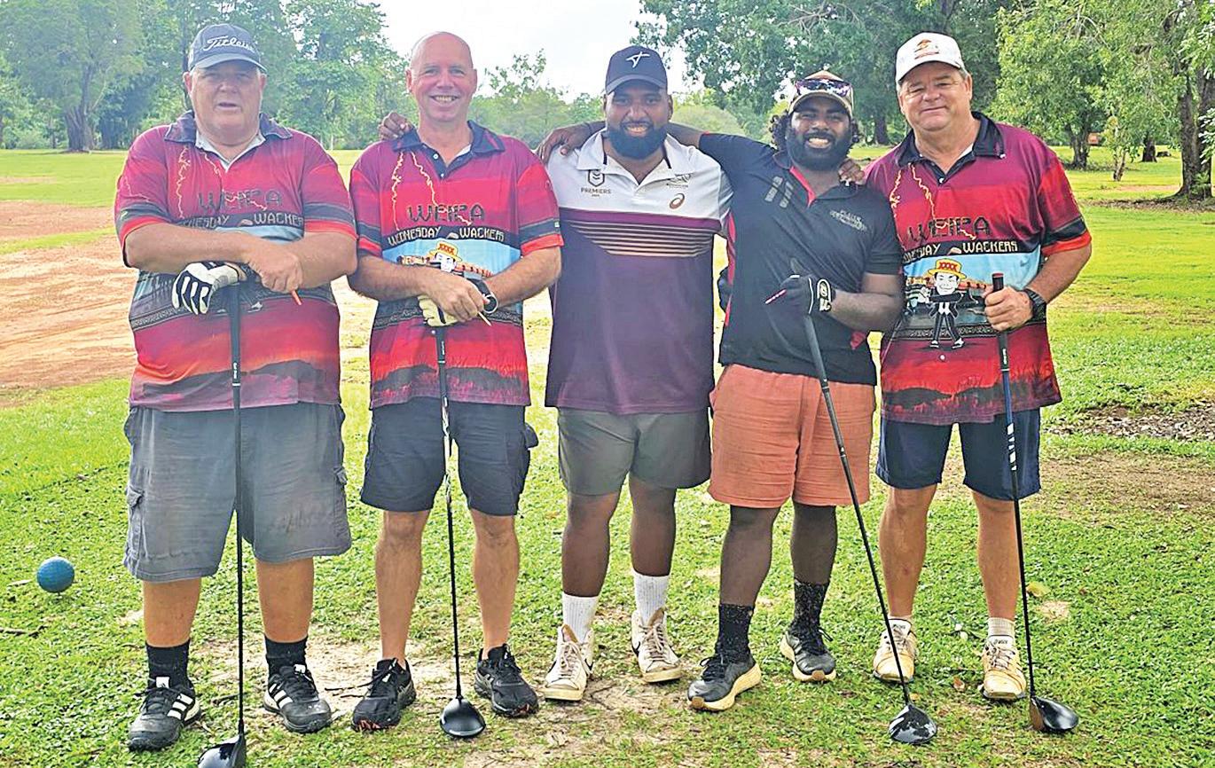 Grant Crossley, Eddy Tiemens, Hari Ginate, Paiwan Lui and Jim “Did Anyone See Where My Ball Landed?” Lucas take time out for a photo between intermittent rain at Wackers in Weipa on 11 February. Photo: Supplied.