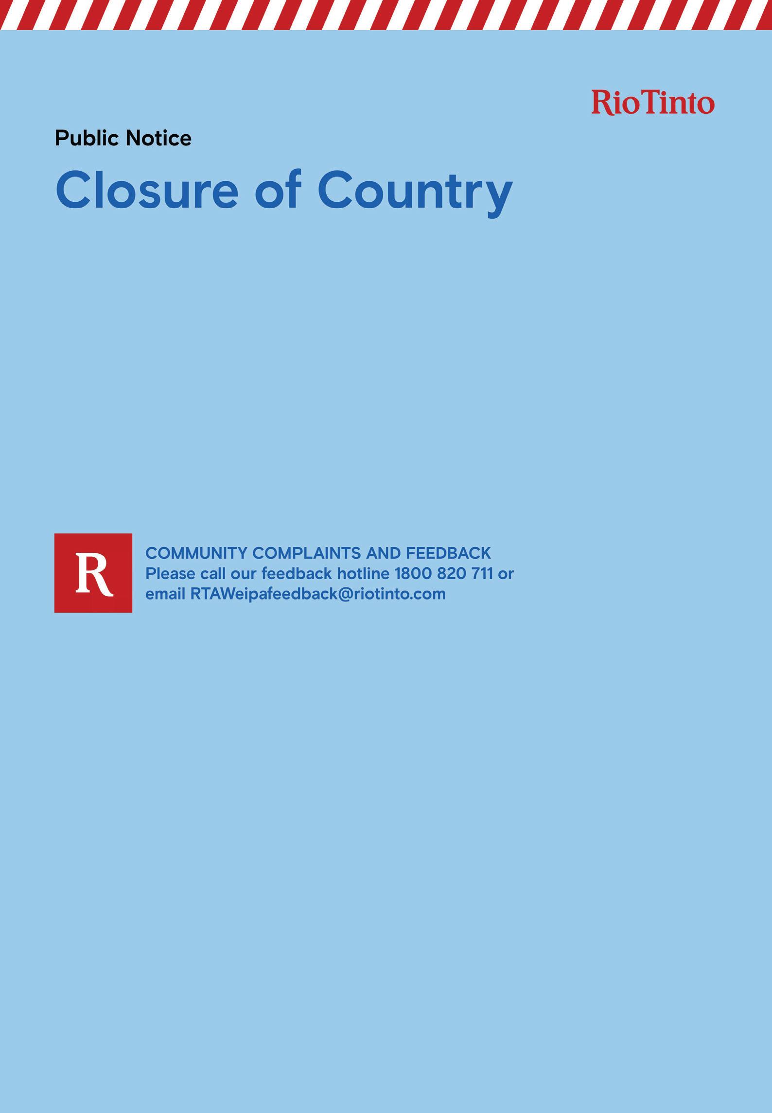 Please be advised that access to Peppan Country is closed until further notice, due to sorry business. It is important that we acknowledge and respect the advice from Traditional Owners so that cultural customs can be observed and practiced. Rio Tinto personnel, contractors and public are not to enter the area until further notice.