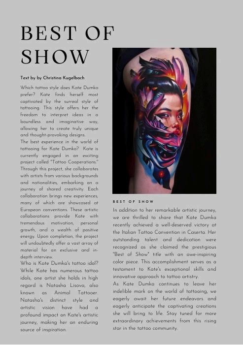 If you have any concerns regarding the use of your image or work, we encourage you to contact us. We value your contributions and are committed to making any necessary adjustments, including removing or replacing your picture as needed. This flexibility is one of the many advantages of a digital magazine, allowing us to ensure that all artists are represented in a manner that aligns with their wishes. Thank you for your understanding and for being part of our vibrant tattoo community.