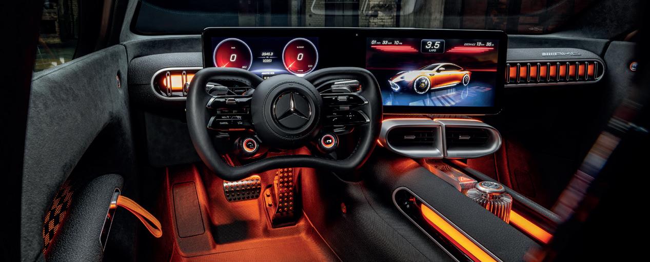 A yoke-style steering wheel similar to that in the AMG ONE hypercar sits ahead of a 10.25-inch digital instrument screen while a 14-inch central touchscreen is angled towards the driver for an immersive feel.