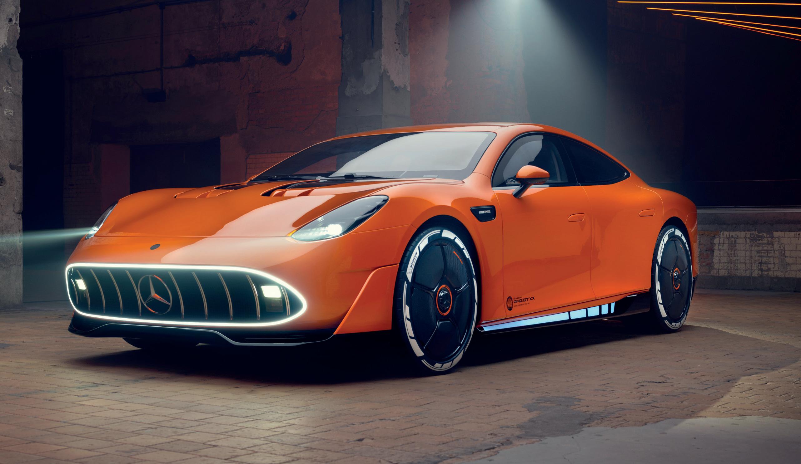 The GT XX’s design clearly draws on the Vision One-Eleven EV concept of 2023, and the C111 of 1969/70 which inspired that car. From its low slippery shape and bonnet-mounted cooling fins to diving coupe-style roof and sunset beam orange paintwork, there are nods to previous concepts.