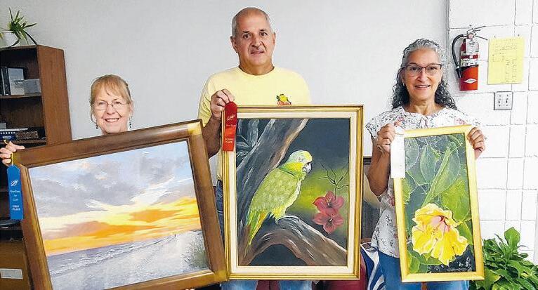 The August winners of the Westbank ArtGuild Artist of the Month competition, from left: first place Glinda Schafer,‘My Sunset’; second place, Wayne Himel, ‘Parrot’; and third place, Peggy DeleryPospisil, ‘Orange/ yellowHibiscus. PROVIDED PHOTO