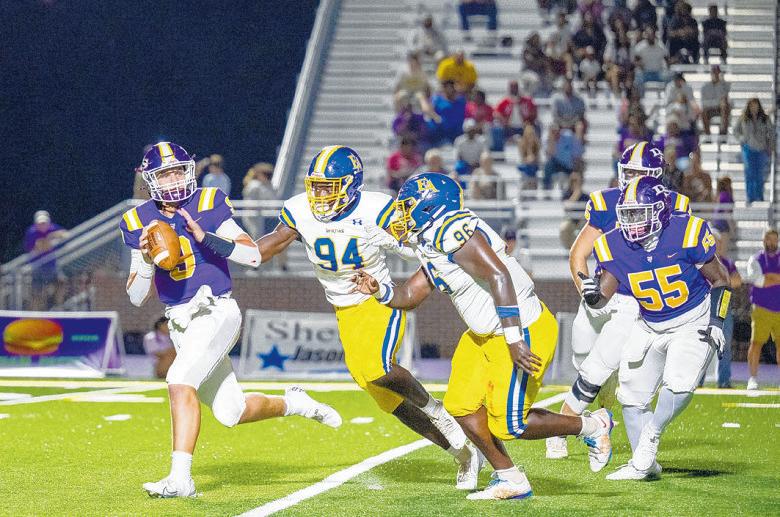 Denham Springs quarterback JerryHorne (9)rolls away from East Ascension defensive linemen Jahmere Smith (94) and John Brown (96) in the second quarter of the District 5-5A matchup on Friday in Denham Springs.