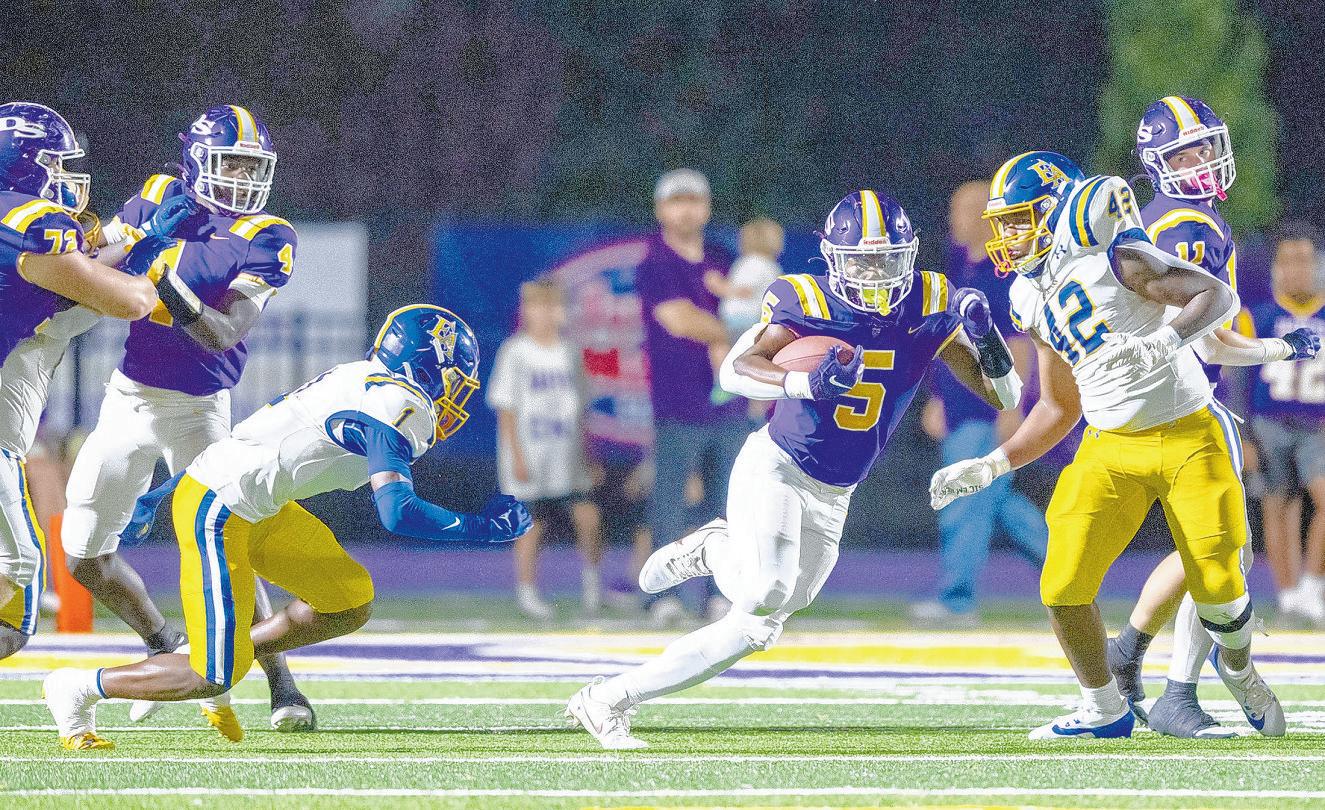 Denham Springs running back Brenton Paul (5) cuts through the hole against East Ascension in thesecond quarterofthe District 5-5A matchup on FridayinDenham Springs.