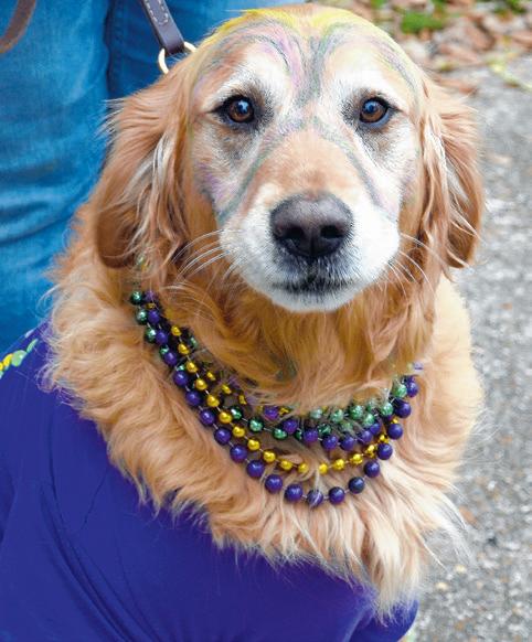 PHOTO BY FRANCES Y. SPENCER Mardi Gras-garbed golden retriever Gus leaves the Krewe de Canine’s inaugural Rollin’ on the River dog parade Saturday.