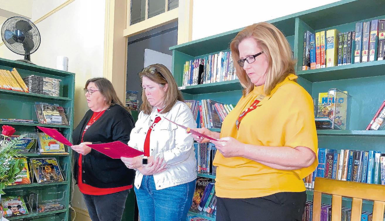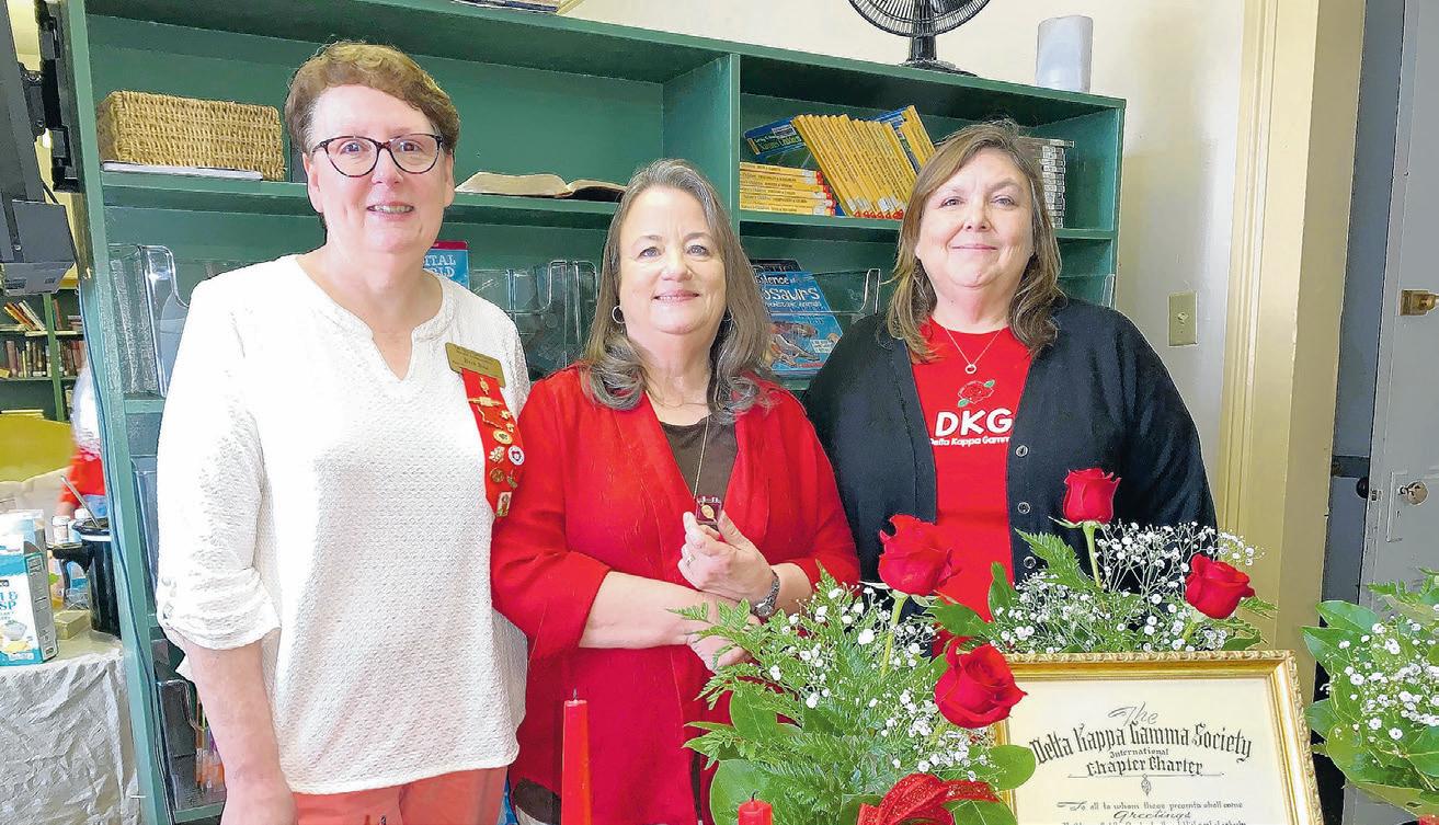 New member of Alpha Mu, June Donze, center, stands with President Beth Box, left, and first Vice President Peggy Reno after Donze’s Feb 8 installation ceremony