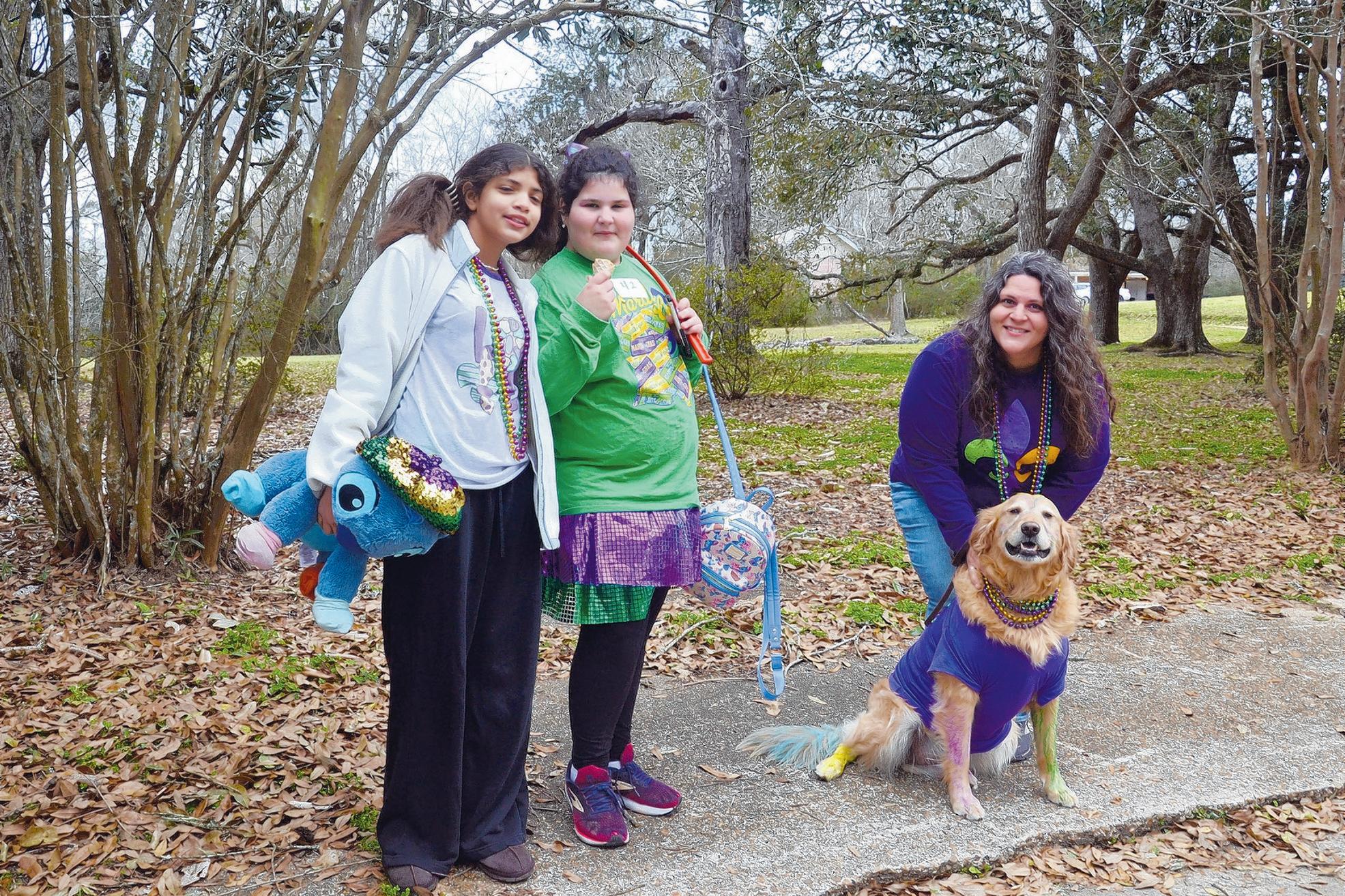 The West Feliciana Animal Humane Society Friends hosted Krewe de Canine’s inaugural Rollin’ on the River dog parade in Parker Park. Canine reveler and former shelter dog Jolene, right, greets Joy who is currently up for adoption while celebrating with organizers, from left, group treasurer and fundraiser Peggy Lucky, shelter lead volunteer worker Jamie Stallone, and benefit parade organizer Pam Malara.