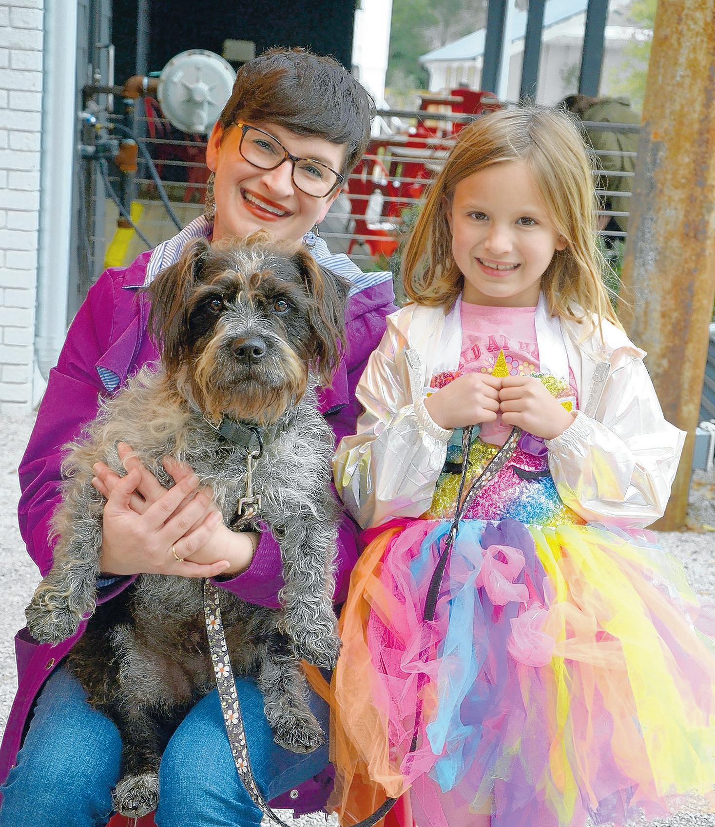 Woody the rescue came to the rescue of other rescues during the Krewe de Canine’s inaugural Rollin’ on the River dog parade. After ditching his costume, he shared a moment with his companions Callie Kemp, left, and Sophie Kemp.
