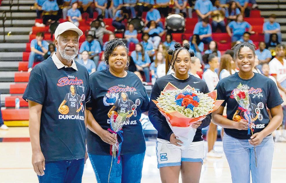 Each senior was honored at the Zachary High girls basketball game on Feb 7, 2025. From left, grandfather Dave Duncan, mother Demetria Williams and and sister Delaysia Duncan, right, are on hand for LaTavia Duncan.