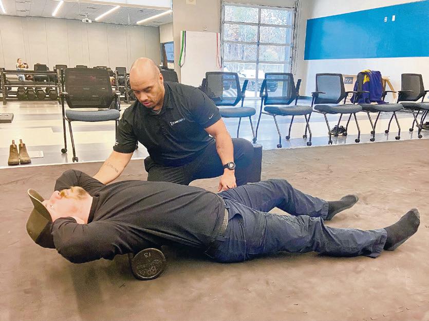 Derek Léger, a lead health and performance coach with Baton Rouge General, helps Zachary police officers use a foam roller to relieve back pain.