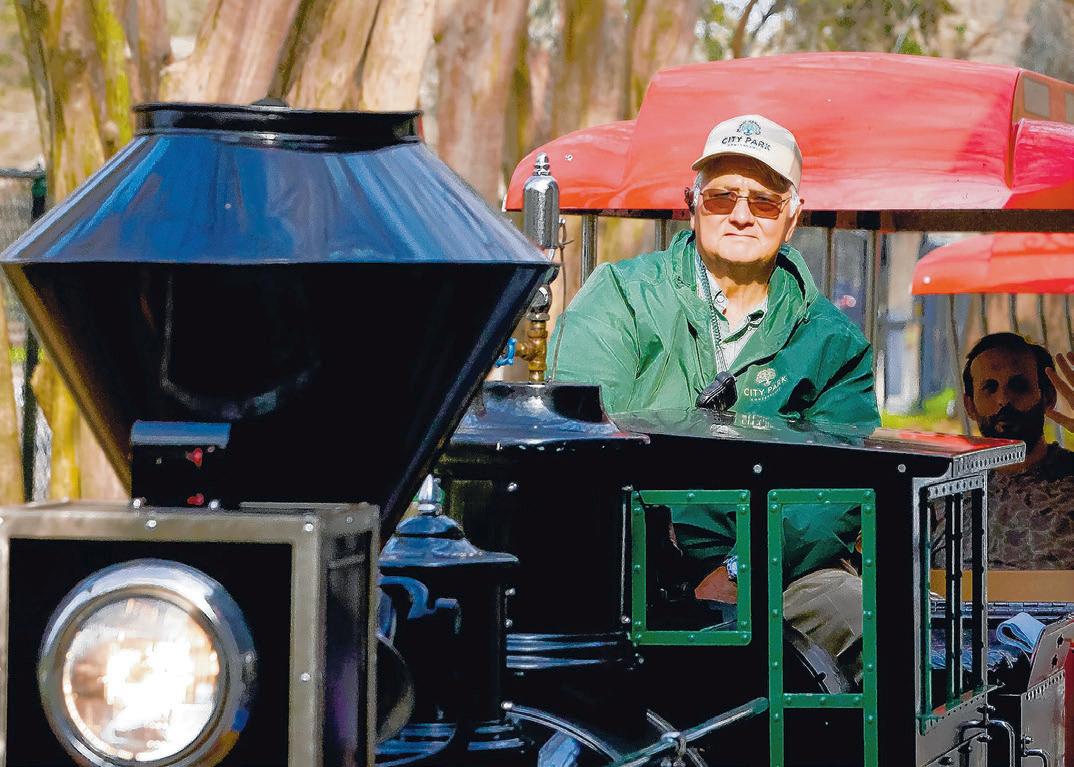 Conductor Randolph Odinet slows the train to a stop at the station in Carousel Gardens Amusement Park.