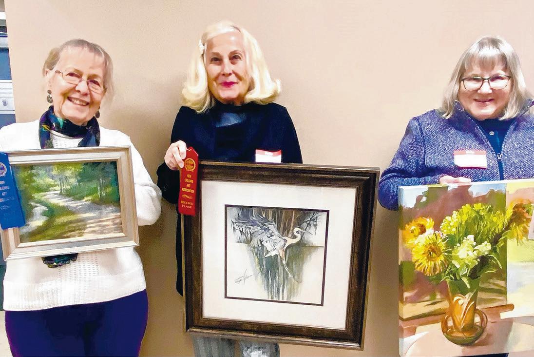 The New Orleans Art Association named its February artists of the month. From left are Glinda Schafer, ‘A Walk in the Woods,’ pastel painting first place; Jan Wilken, ‘Ready for Takeoff,’ watercolor painting, second place; and Helen Valenti, ‘Summer Flowers,’ oil painting, third place.