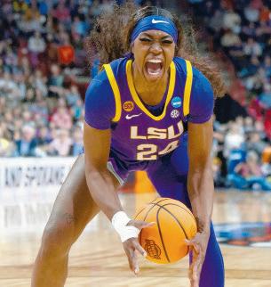 LSU’s Sa’Myah Smith, left, and Aneesah Morrow celebrate after the Tigers’ 80-73 win over North Carolina State in the NCAA women’s basketball tournament on Friday in Spokane, Wash. Morrow led the Tigers with 30 points and 19 rebounds, while Smith contributed 21 points and 11 rebounds Mikaylah Williams chipped in with 19 points, 8 rebounds and 6 assists. The Tigers play again Sunday with a chance to advance to the Final Four ä Complete coverage in Sports, Page 1C. TIGER SW