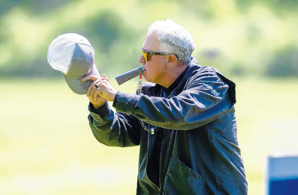 Handler Lyle Steinman uses a whistle and hand signals to give directions to Bogey