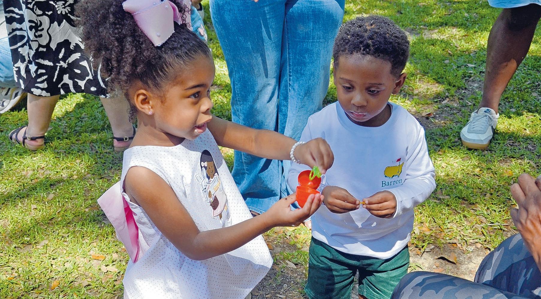 Maddie Barnes and Barron Mim discover toys and treats inside plastic eggs.