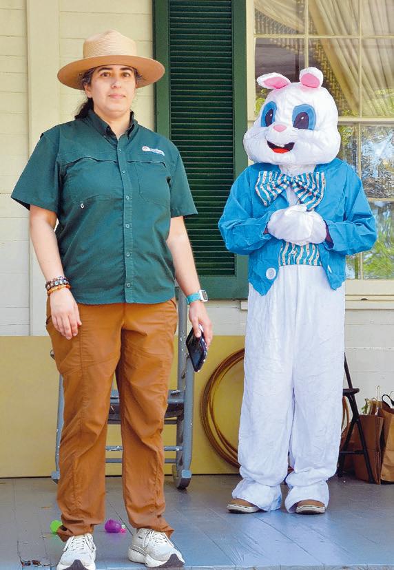 Interpretive Ranger Sasha Traña, accompanied by the Easter Bunny, offers instructions at the egg hunt.