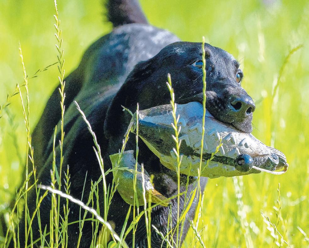 AJ races through the grass with a decoy duck to bring back to handler Lyle Steinman.