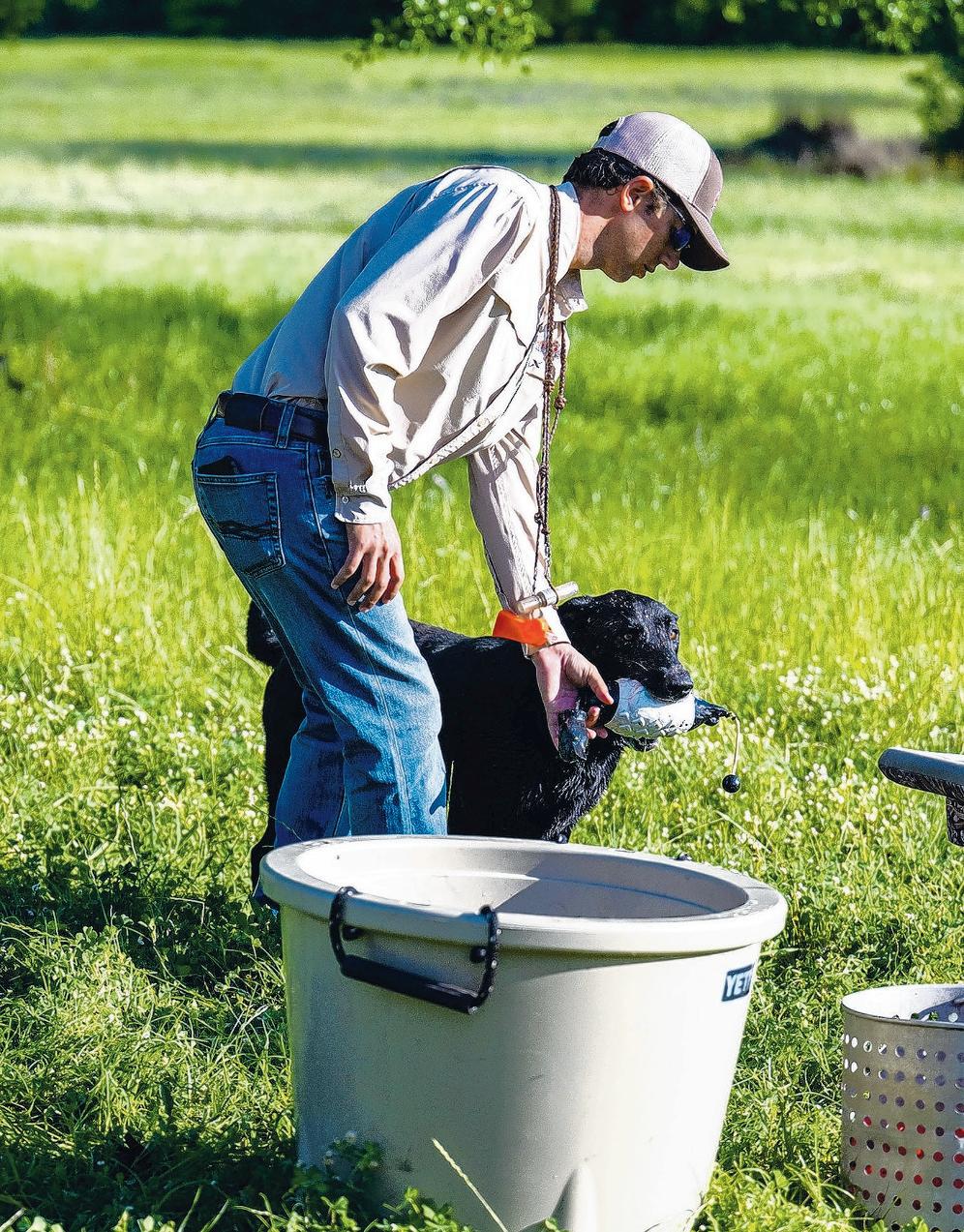 Handler Carter Turner takes a decoy duck from Joe
