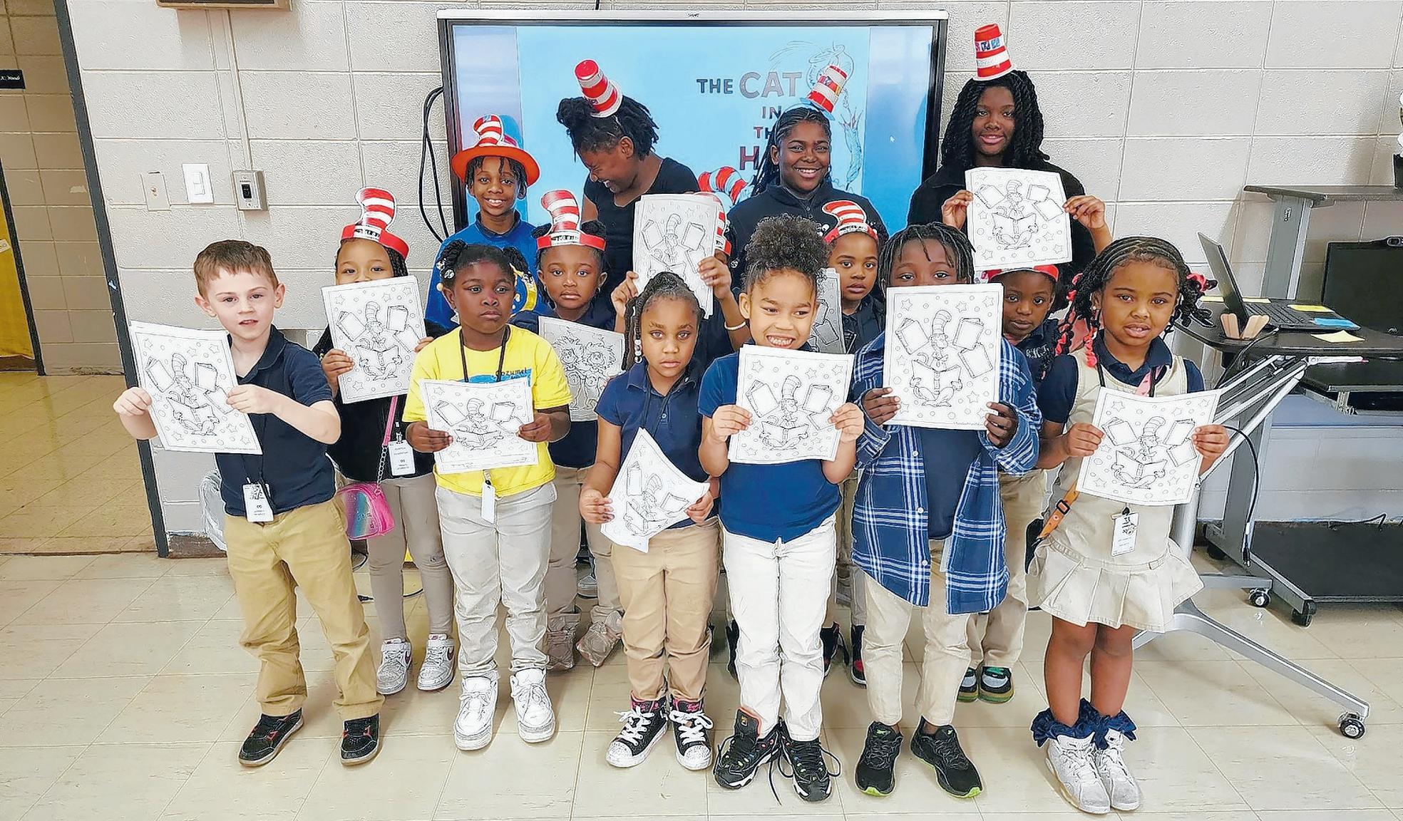 As part of Read Across America Week, fifth and sixth grade students at Clinton Elementary School read Dr Seuss stories to Pre-K through second grade students and engaged them with activities based on the stories March 7, 2025. Participating are, from left, front row, Jarred Searcy, Triniti Johnson, Skye Walker, Tianna Scott, Khari Davis, Brooklyn Profit, Kinslee Paul, Antonie McElwee, Eyarah Keller and Irmani Chriss; and back row, Brandon Dunn, Ariana Magee, Akira Ringo and Cooper Johnson.