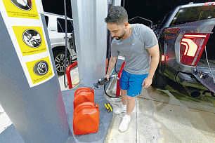A local fills fuel containers at a gas station in San Juan, Puerto Rico, during an islandwide blackout Wednesday.