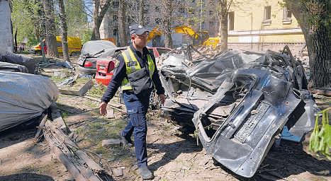 A police officer passes by the remains of cars on Friday that were damaged in a Russian missile attack that struck homes Thursday in Kyiv, Ukraine, killing 12 civilians and injuring 87.