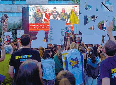 People watch a live broadcast Monday at a plaza known as Hostage Square in Tel Aviv as Israeli-American soldier Edan Alexander is released from Hamas captivity in Gaza.