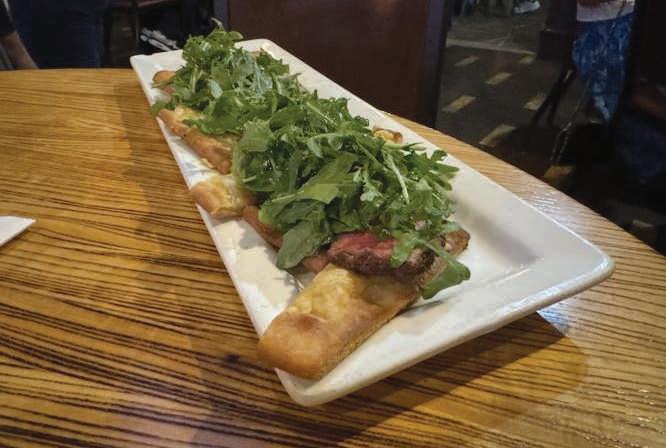 The first thing Ithoughtwhen Iwalked into Bin 77 is thatsomething smells good. The second thing:I wish Ihad areservation. My 7:30 p.m. dinner turned into 9:15 p.m. with the lineahead of me, but the steak and Gruyereflatbread morethan made up forit. The grilled tenderloin pairsperfectlywiththe cheeseand arugulasothatit’snot toooverpowering, and the diversityofflavorson the platemakeitsothatyou cansavor every last bite.It’slikethe best parts of eating apizza with the vibes of aslightly elevated restaurantwith live music. It wasworth the wait