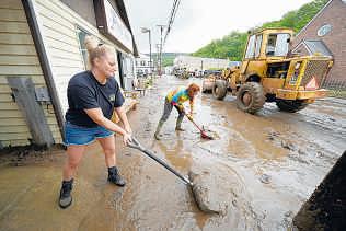 ASSOCIATED PRESS PHOTO By GENE J PUSKAR Ashley Rishel, left, of the Allegany County 911, and Lesley Moran help clean up Main Street on Wednesday after fl