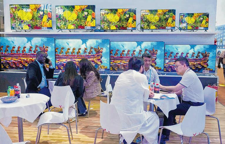 Visitorstalk to asales rep for televisions April 15 at the 137thCanton Fair in Guangzhou in southernChina’sGuangdong province.
