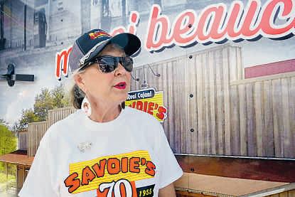 Owner Donna Savoie Messner enjoys the camaraderie and food served during the Savoie’s Foods 70th anniversary employee celebration on Thursday in Opelousas.