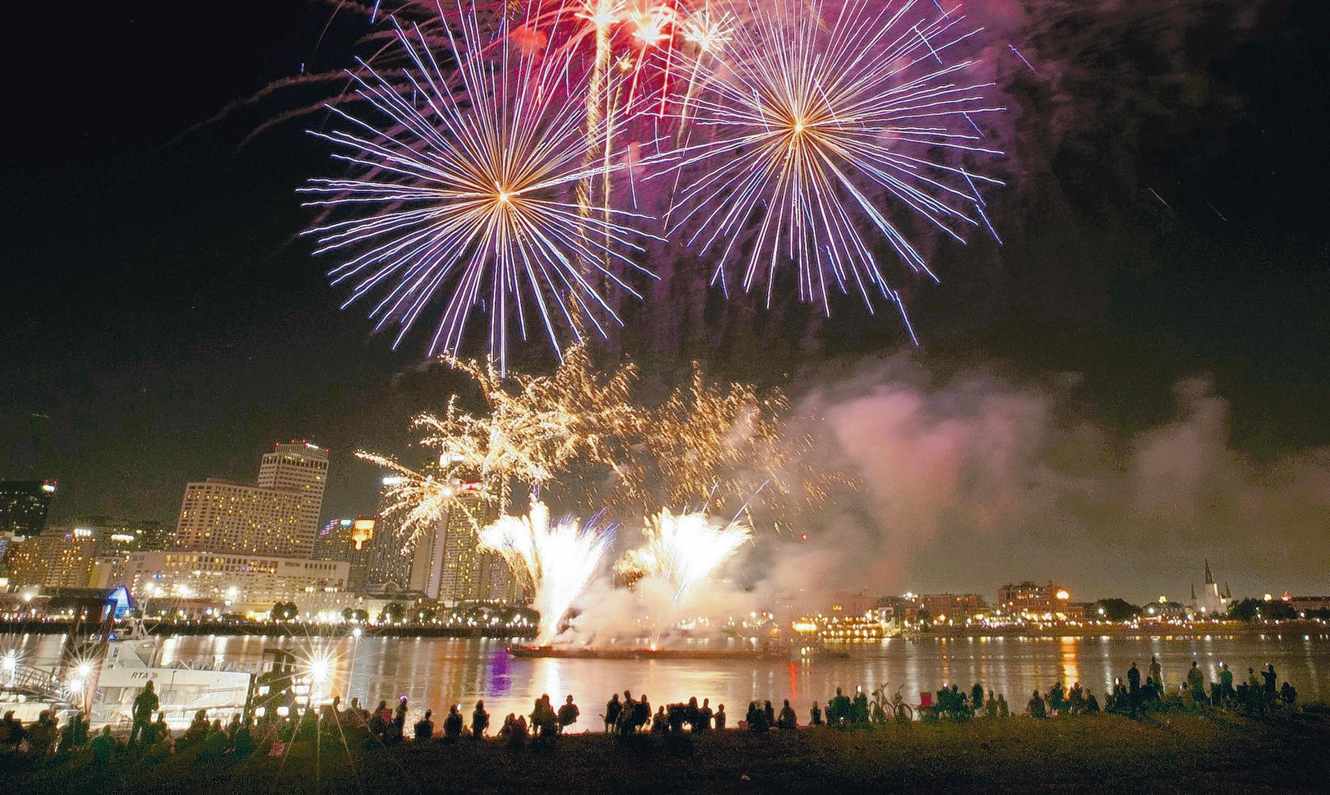 Go 4th on the River climaxes with the annual fireworks display in New Orleans. Spectators lined the levee at Algiers Point for riverfront seats.