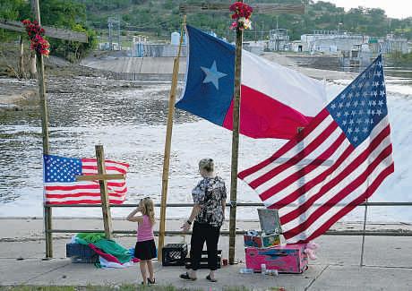 NancyEpperson, right, and BrooklynPucek, 6, visit amemorial for flood victims along the Guadalupe River on Thursday in Kerrville, Texas