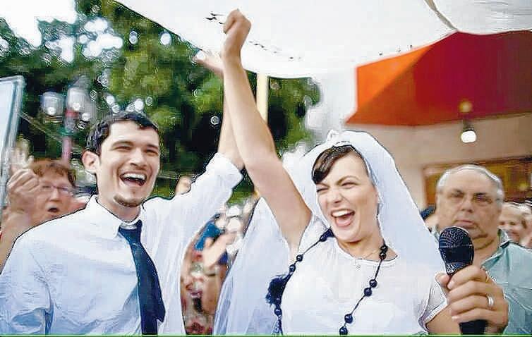 yulia Tagil and Stas Granin celebrate their union on July 25, 2010, at a square in Tel Aviv. The couple held a public wedding to protest Israeli marriage guidelines set by the chief rabbinate.