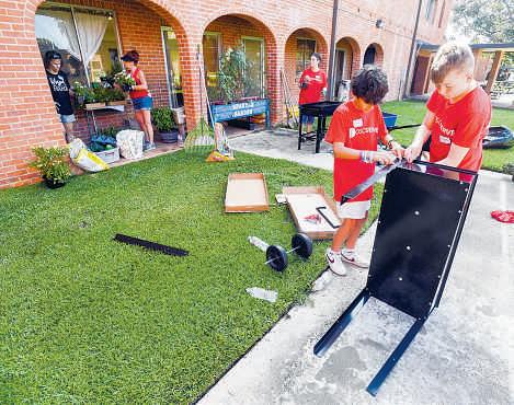 Volunteers Cohen Waguespack and Max Flor put together a new planter during a school cleanup day at Comeaux High School on Saturday
