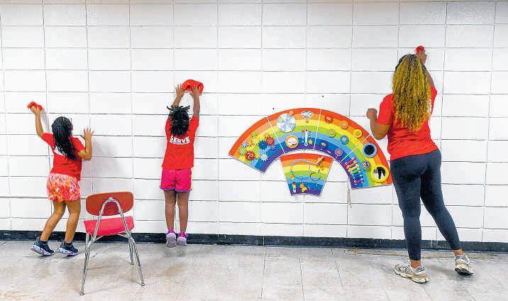 Volunteers wipe down walls in a classroom during a school cleanup day at Comeaux High School on Saturday. School volunteers, staff and students along with Our Saviors Church and the Rotary Club South came together to clean up repair and beautify the school before the new school year