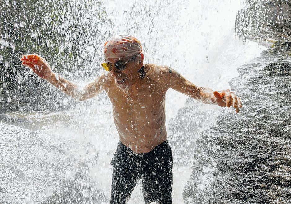 Shirtless and soaking,Chris Roseclears the waterfall’scascade and wipes hiseyes, unabletostifle a smile.