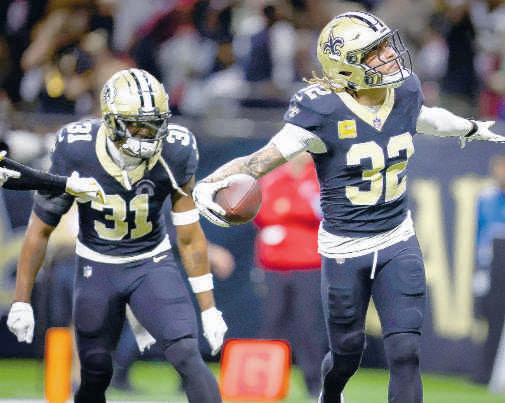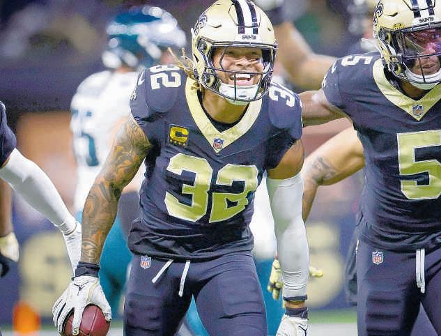 Saints safety Tyrann Mathieu celebrates after an interception last seasonagainst the Eagles.