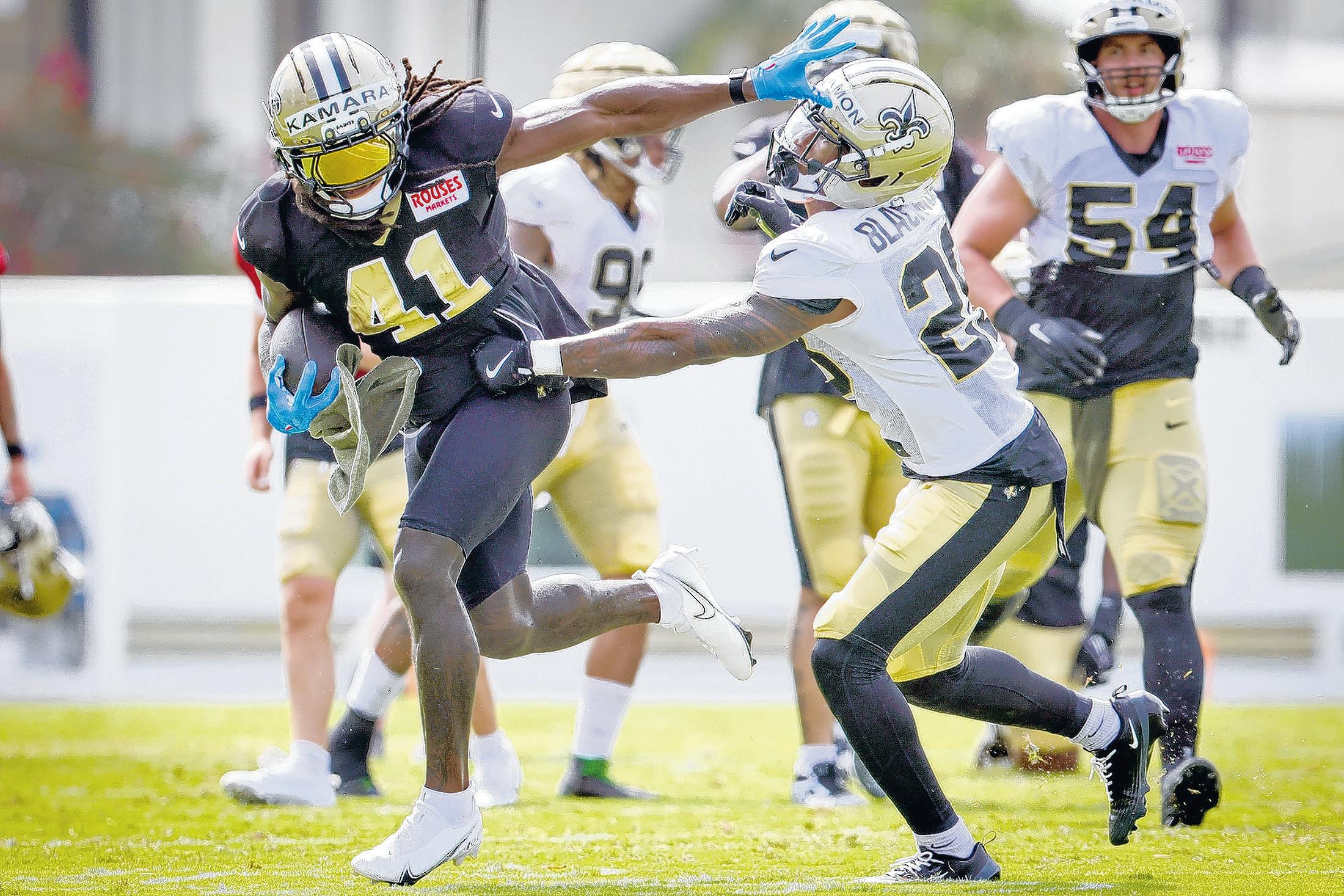 New Orleans Saints star running back Alvin Kamara, left, runs the ball as Julian Blackmon, right, defends during training camp in Metairie on July 30.