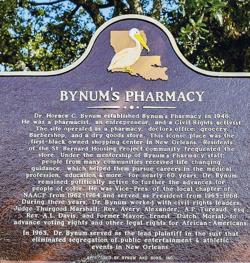 Nearly 80 years after the opening of a local pharmacy gave Black residents of New Orleans’ St. Bernard neighborhood better access to medicine and health care, officials honored the business and its founder by adding the site to the state’s Historic Marker Registry Bynum Pharmacy, opened in 1947 by pharmacist and civil rights leader Horace C Bynum Sr., was formally rec-