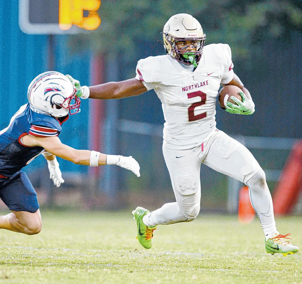 Northlake Christian’s Kameron Casnave stiff-arms a Hannan defender for a gain on Sept. 5.