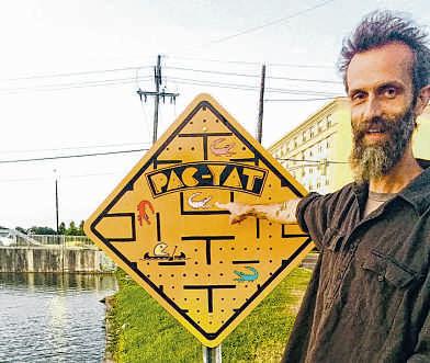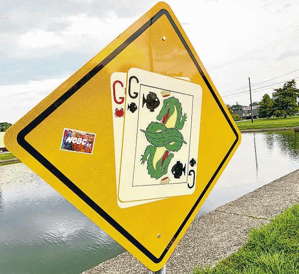 Aroad closed sign at the corner of Ursulines Avenue and Decatur Street has ahole in it.