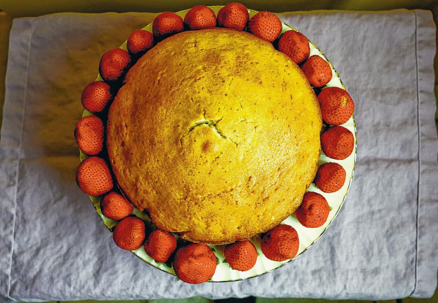 oil cake is moist and fruity I like strawberries and blueberries, but use what is available. You can make it an even better celebration if you have a glass of Madeira. The olive oil keeps the cake moist for days, but don’t worry, it won’t last that long. You can raise a glass to toast the waning summer and the coming of the celebration season.