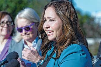U.S. Rep.-elect AdelitaGrijalva,D-Ariz., is surrounded by supporterscalling for House Speaker MikeJohnson to swear herinrecentlyatthe Capitol in Washington.